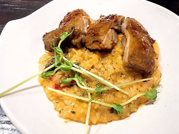 卡菲醬雞腿燉飯有種多力多滋的口感,飯的味道超濃郁,反而雞肉顯得單薄,雞肉微乾;